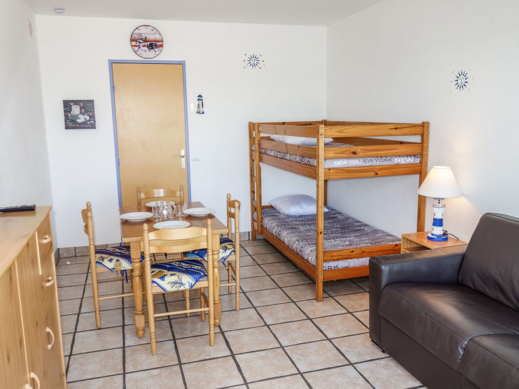Studio 1-kamer 21 m2 op de 2e verdieping. Woon-/eetkamer met 2 divanbedden (120 cm, lengte 190 cm), TV (Flatscreen TV). Kookhoek in de hal (mini-oven, oven, 2 keramische glas kookplaten, elektrische koffiemachine). Bad/WC. Terras 7 m2, op het zuidoosten gelegen. Terrasmeubelen. Ter beschikking: Internet (WiFi, extra). Maximaal 1 huisdier/hond toegestaan. Rookmelders.
