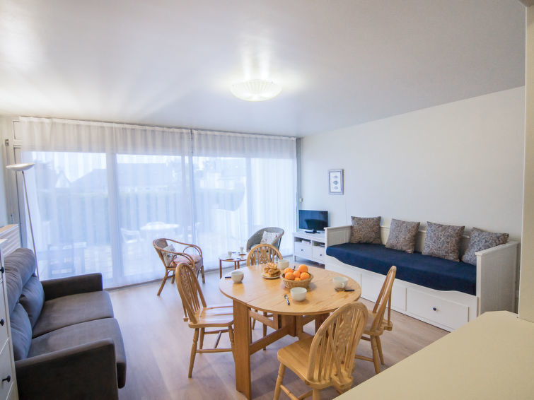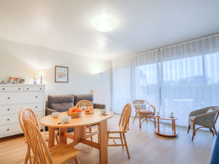 Studio 1-kamer 35 m2, op de begane grond. Comfortabel en mooi ingericht: woon-/eetkamer met 1 2-pers divanbed (1 x 140 cm, lengte 190 cm), TV. Uitgang naar het terras. Keuken (oven, afwasmachine, 3 keramische glas kookplaten, magnetron) met doorgeefluik. Douche, aparte WC. Gas-verwarming. Groot terras 24 m2. Terrasmeubelen. Ter beschikking: wasmachine, strijkijzer. Internet (WiFi, extra). Parkeerplaats nr. 9. Rookmelders. 56186 000641 7D