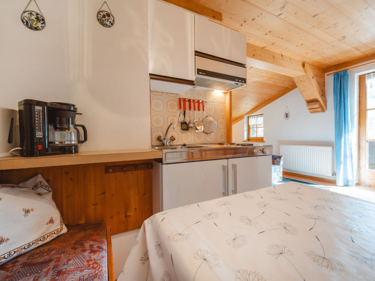 "Weissbacher", appartement 1-kamer 28 m2 op de 1e verdieping. Gezellig en met veel hout ingericht: woon-/slaapkamer met 1 2-pers bed, eettafel en eethoek. Kookhoek (2-pits kookplaat, oven, waterkoker, elektrische koffiemachine). Douche/WC. Verwarming. 1 huisdier/hond toegestaan. 50620-000788-2022